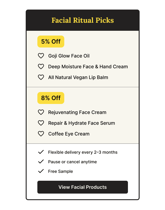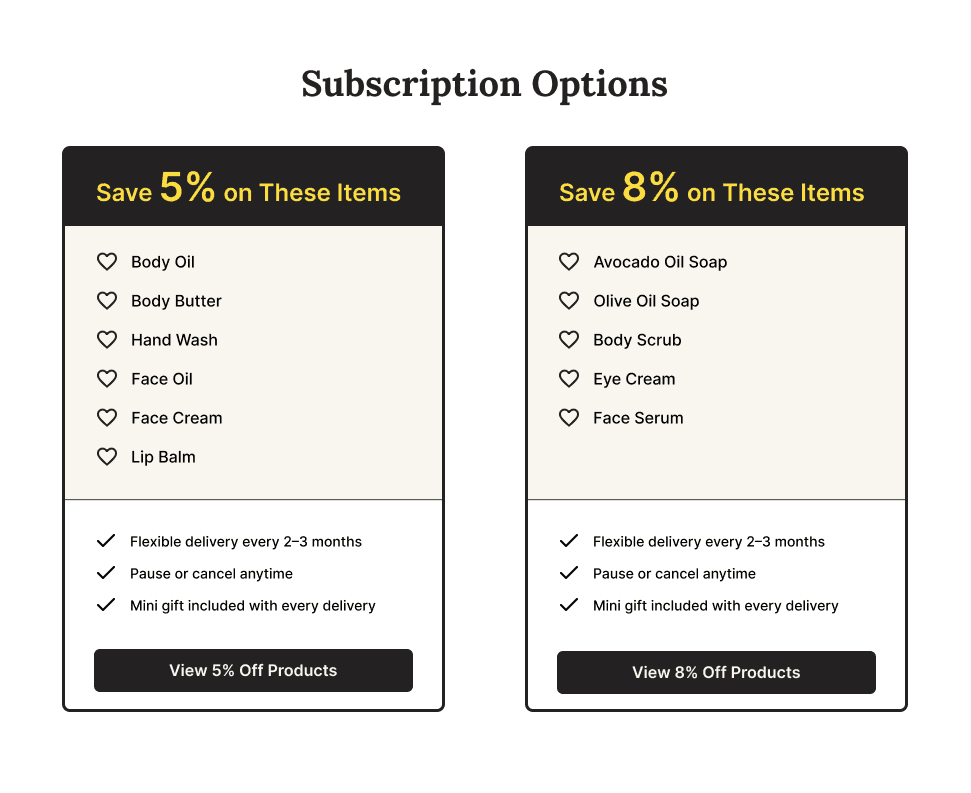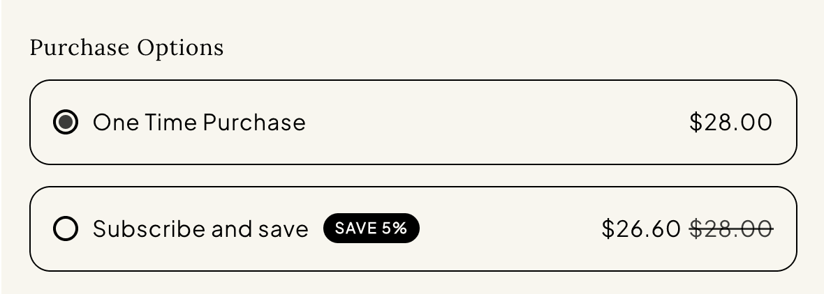To prompt quick decision-making and build trust, I used discount labels and visual pricing differences alongside clear subscription frequency options. To align with different product usage cycles, I offered two simple delivery frequencies—every 2–3 months or 5–6 months. This streamlined approach avoids overwhelming users while still giving them control, making subscriptions feel more relevant and easier to commit to.