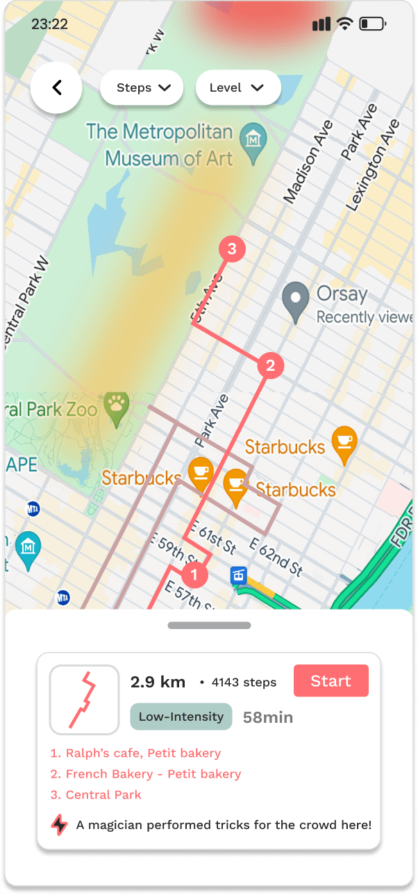 Build personalized routes based on users' interests or needs selected for the day, using surprises as motivation to help them explore the city through unfamiliar attractions.